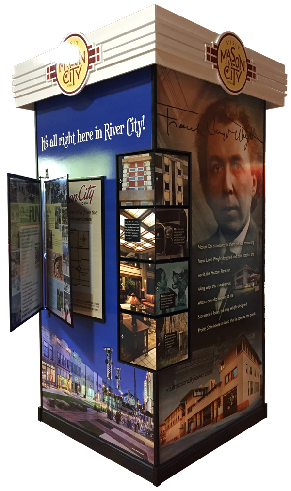 On one corner rotating blocks were installed that feature trivia, giving guests the opportunity to learn more about Frank Lloyd Wright architecture and Meredith Willson. A photobook was installed on another panel featuring hotels, restaurants and other local attractions. The pages of the photobook can be interchanged as needed and allow for more space for displaying photos of the area.