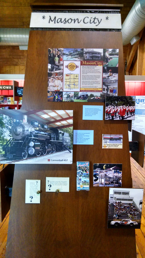 The old Visit Mason City Welcome Center display was informational with some interactive displays. However, it didn’t really stand out to guests passing through the center. The area in the Welcome Center where the display was placed had no access to electricity limiting the interactivity within the display. The option of moving the display was considered, but the decision was made to leave the display in its current location and develop a more creative display that would be more interactive and attention-grabbing.